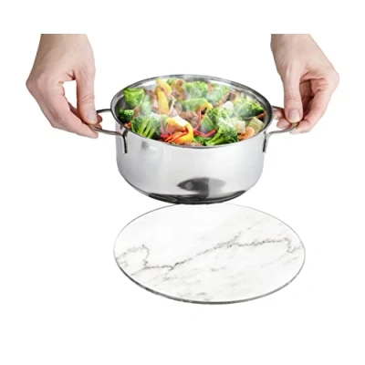 Reliable protection: the ingenious trivet made of tempered glass provides protection for tables, worktops and furniture from glass marks, stains, heat and scratches Versatile: the glass coaster is ideal for placing pots, pans, casserole dishes, cake moulds, teapots etc. DECORATIVE - The mat not only protects effectively but also looks good. With its trendy marble look, the coaster brings a sophisticated ambience to any kitchen and table. Thanks to the clever suspension on the back, the glass coaster can also be used as a decorative object when not in use Scratch protection: the coaster is equipped with four non-slip silicone feet that ensure a firm stand on the table and protect the surface from scratches Box contents: 1 x round marble trivet, dimensions (W x D x H): 20 x 0.8 cm, made of tempered glass, transparent silicone feet