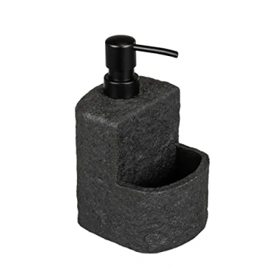 AmazonHigh-quality detergent or soap dispenser with integrated storage for washing up sponges High quality black stone effect polyresin Black plastic pump for portioned detergent dispensing Refillable, capacity approx. 380 ml Dimensions (W x H x D): 10.5 x 18 x 11 cm
