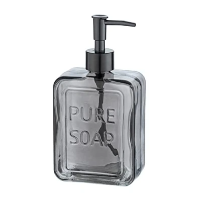 PURE SOAP - The rectangular glass pump dispenser is sturdy and generously constructed. Genuine and unadulterated, the angular design Pure Soap dispenser from Wenko keeps soap and lotion always at hand Extravagant design: the soap dispenser is reminiscent of an upright, angular soap piece. The horizontal lettering Pure Soap on the pump bottle rounds off the modern design in combination with the black pump attachment. Flexible use: whether in the kitchen, in the bathroom or in the guest toilet, the refillable dispenser for hand soap keeps soap, disinfectant and lotion always practical. If necessary, the pump dispenser can also be filled with up to 550 ml of detergent. High-quality materials: the impressive bathroom accessory is made of high-quality yet sturdy glass. The dispenser head in black is made from durable plastic - the combination of quality and design makes the hand soap dispenser an essential bathroom essential. Box contents: Wenko Pure Soap dispenser, refillable dispenser for liquid soap made of glass, capacity 550 ml, (W x H x D): 9.5 x 20 x 6 cm, grey, Weight: 1.02294489568 Pounds, Manufacturer: WENKO