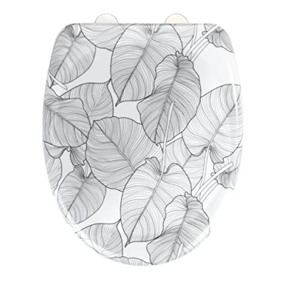 Attractive decor: The Samoa toilet seat by WENKO has grey leaves. On a white background, the natural décor is unobtrusive and blends harmoniously into existing interior design styles. WENKO also offers the matching Rivalta free-standing toilet brush set and Samoa shower curtain. Easy mounting: Equipped with the 1-button Fix-Clip stainless steel fastening, the durable toilet seat is easy to attach to the toilet bowl. The stainless steel fastening is attached to the ceramic by means of a rubber insert, and additional buffers with extra-sturdy holders on the sides prevent slipping. Hygienic cleaning: The Fix-Clip fastening also makes it easy to remove the toilet seat. With just one push of a button, the WC seat can be detached again for cleaning the toilet, making even otherwise hard-to-reach places accessible. This way, you have maximum hygienic safety. Robust quality: The entire construction of the utensil for the sanitary area is made of scratch-resistant Duroplast. The shatter-proof toilet seat is equipped with an Easy-Close soft-close mechanism that gently closes the toilet lid. The wall buffers included in the scope of delivery protect against possible scratches on the wall. Optimal dimensions: The toilet seat fits all standard toilets. The lid with décor measures (W x H): 38 x 45 cm, the white toilet seat has a dimension of (W x H): 37.5 x 41.5 cm. The opening measures (W x H): 23 x 27.5 cm. The hole spacing is a minimum of 8.5 cm and a maximum of 18.5 cm., Weight: 5.06842740338 Pounds, Manufacturer: WENKO