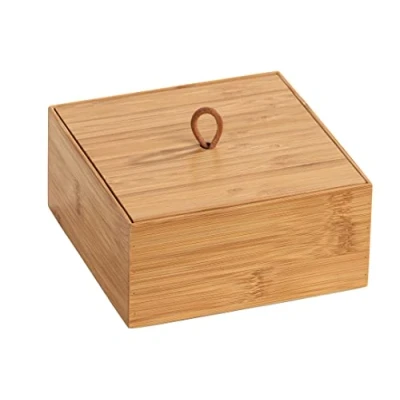 Modern storage box for bathroom, guest toilet, kitchen and study with practical lid Ideal for storing jewellery, cosmetics or office supplies and kitchen utensils Made from high-quality, resistant bamboo, trendy as a rapidly renewable raw material Versatile and can be combined with many other shelves and boxes from the Terra bathroom series Dimensions (W x H x D): 15 x 7 x 15 cm Note: the article is made of bamboo. Bamboo is a natural material. There may be color deviations here.