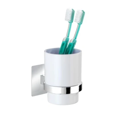 Turbo-Loc wall mounting system: Special adhesive pad for easy installation without the need for screws or drilling. Can be removed without leaving any residue. Extra strong hold on all smooth surfaces. Dimensions (W x H x D): 7 x 10 x 9.5 cm. The toothbrush holder is made from plastic and stainless steel.