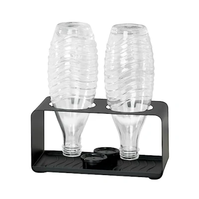 Compact bottle holder for quick drying of common bottle types Drainer for up to two bottles at the same time Removable plastic drip tray with groove system Holder made of powder-coated metal in matte black Dimensions (W x H x D): 23.5 x 11.5 x 11.5 cm