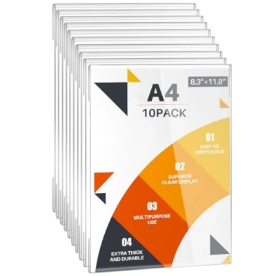 【Landscape or Portrait Orientation】Available in both horizontal (landscape) and vertical (portrait) versions to perfectly fit your display needs. Ideal for A4 documents including menus, certificates, advertisements, and artwork (21×29.7cm). 【Easy to Install & Universal Adhesion】Includes high-quality adhesive strips for long-lasting hold. Easy peel-and-stick installation works on most smooth surfaces without tools or drilling. 【Effortless to Update Content】Easily swap out A4 rotating menus, promotions, or children’s art in seconds for effortless updates. 【Crystal Clear & Durable】Made with durable 2.0mm crystal-clear acrylic that resists scratches and yellowing. Crystal clear acrylic maintains document visibility. Easy to clean with a damp cloth. 【Multiple Pack Options & Reliable Service】Choose from different quantity packs to suit your needs, with greater savings on larger sets. Backed by 24/7 customer support for any inquiries.