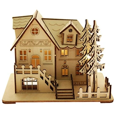 Illuminated by 5 warm white led's this wonderful wooden house is packed full of intricate detail. It has a large staircase to the front door, numerous windows and a large illuminated tree. The led's create a fantastic effect on the buildings by illuminating the windows so it looks like the buildings are really occupied! Battery Operated by 3 x AA Battery (Not supplied) Size: 20 x 15 x 14.5cm