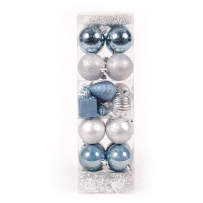 This delightful 28 piece decoration pack features a variety of baubles plus shiny tinsel and a 5 metre beaded garland. The baubles range from xmas presents, heart shaped plus a variety of 60mm round ones in a various finishes. The finishes include glitter, matt and shiny all in a complimentary blue and silver. Comes complete with Hanging String. Please note we also sell plastic bauble hooks if you prefer to use these. Sizes include 60mm round baubles, 5m long beaded garland, 2.7m Tinsel