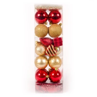 This delightful 28 piece decoration pack features a variety of baubles plus shiny tinsel and a 5 metre beaded garland. The baubles range from xmas presents, heart shaped plus a variety of 60mm round ones in a various finishes. The finishes include glitter, matt and shiny all in a complementary Red and Gold finish. Comes complete with Hanging String. Please note we also sell plastic bauble hooks if you prefer to use these. Sizes include 60mm round baubles, 5m long beaded garland, 2.7m Tinsel