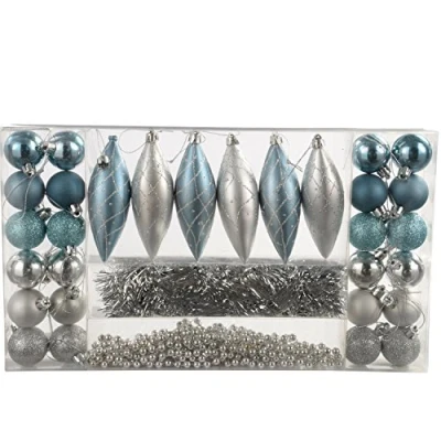 WeRChristmas 32 Piece Deluxe Variety Christmas Tree Baubles Decoration Pack with Tinsel and Beads, Blue/Silver
