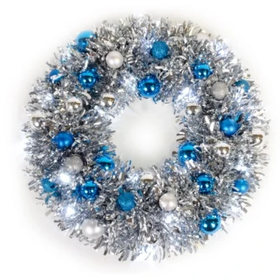 WeRChristmas 36 cm Pre Lit Tinsel Wreath with Baubles 20 LED Lights Christmas Decoration, Silver/ Blue