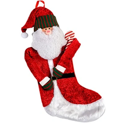 This lovely stocking features a beaming Santa made from soft red fabric He features black felt eyes, a traditional bushy beard and is carrying a little candy cane; he comes in has red suit and hat WeRChristmas incorporated a hanger into the top too so if you prefer to hang this from the mantel piece it's easy to do Can be used simply as an ornament or a stocking for those special little treats Size: Height 55 cm (22 inches)