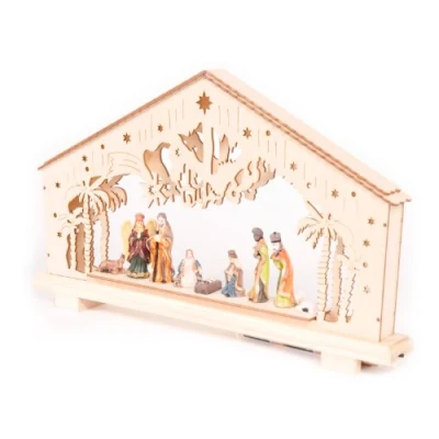18" Battery Operated Wooden Nativity Scene with 5 Warm White LED Lights This lovely Nativity scene is made from precision cut wood and is inlaid with little stars around the edges. Baby Jesus is lying in the manger surrounded by Mary, Joseph and other characters. They are all hand painted too. The scene is illuminated and looks great at night on the mantelpiece or in your window. Requires 3 x AA batteries (Not Supplied)