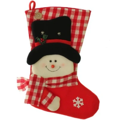 This Christmas stocking features a jovial looking Snowman complete with a tartan backdrop and trim around his hat. He features bead eyes and a traditional carrot nose plus a broad beaming smile. There's even a decorative snowflake motif on the foot of the stocking. Can be used simply as an ornament or a stocking for those special little treats. Size: 21 inches (53cm)