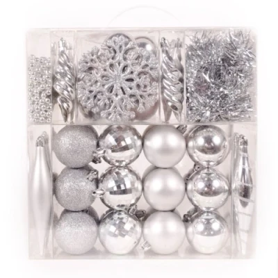 WeRChristmas 60 Piece Deluxe Variety Christmas Tree Baubles Decoration Pack with Tinsel and Beads, Silver
