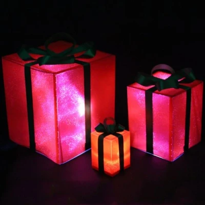 An absolutely stunning set of 3 illuminated led Christmas presents that come in a shimmering red finish with green ribbons. Whether used as a stand alone decoration or merged with the presents under the tree this really is beautiful. The small present contains 1 led comes with a button cell battery. The medium has 3 and requires 2 x AA batteries (Not supplied) whilst the largest has 6 and again requires 2 x AA Batteries Small - 7x7x10cm, Medium - 15x15x18cm, Large - 22x22x25cm