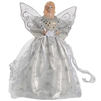 The angel comes dressed in a wonderful silver layered dress with lace finish and edged in silver trim She's wearing a lovely bow on the front with a little rose to the centre The wings are a stunning silver too with intricate patterns and she comes with light brown hair Under the dress is a discreet plastic cone which keeps the shape of the dress and makes mounting the angel on the tree really simple Size: Height 25 cm (10 inches) WeRChristmas angel comes dressed in a wonderful silver layered dress with lace finish and edged in silver trim She's even got a lovely bow on the front with a little white rose to the centre The wings are silver too with intricate patterns and she comes with light brown hair Under the dress is a discreet plastic cone which keeps the shape of the dress and makes mounting the angel on the tree really simple Size: Height 25 cm (10 inch)