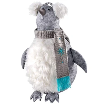 Our Christmas Penguin Figurine will look stunning in your home during the festivities He is wearing striped earmuffs and a grey knitted scarf with a blue fringe trim and embroidery He has a furry belly, classic webbed feet and a beak He is freestanding Height: 40 cm / 16 inch