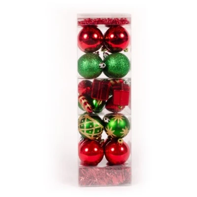This delightful 28 piece decoration pack features a variety of baubles plus shiny tinsel and a 5 m beaded garland The baubles range from xmas presents, heart shaped plus a variety of 60 mm round ones in a various finishes The finishes include glitter, matt and shiny all in a complementary red and green finish Comes complete with hanging string, please note we also sell plastic bauble hooks if you prefer to use these Size: include 60 mm round baubles, 5 m long beaded garland, 2.7 m tinsel This delightful 28 piece decoration pack features a variety of baubles plus shiny tinsel and a 5 m beaded garland The baubles range from xmas presents, heart shaped plus a variety of 60 mm round ones in a various finishes The finishes include glitter, matt and shiny all in a complementary red and green finish Comes complete with hanging string, please note we also sell plastic bauble hooks if you prefer to use these Size: include 60 mm round baubles, 5 m long beaded garland, 2.7 m tinsel