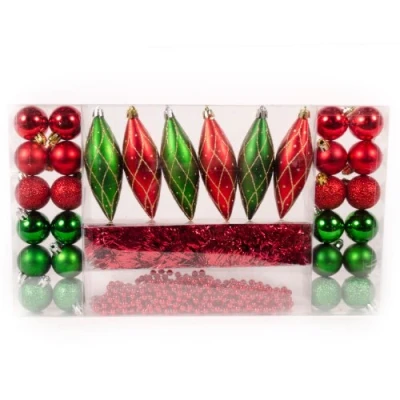 This delightful 32 piece red and green pack features a variety of baubles plus shiny tinsel and a 5 m beaded garland The baubles range from teardrops to a variety of 40 mm round ones with a variety of finishes WeRChristmas extensive range of bauble packs come in a variety of size and colours to suit all tastes Comes complete with hanging string, please note we also sell plastic bauble hooks if you prefer to use these Size: include 40 mm round baubles x 24, 5 m long beaded garland, 2.7 m tinsel This delightful 32 piece red and green pack features a variety of baubles plus shiny tinsel and a 5 m beaded garland The baubles range from teardrops to a variety of 40 mm round ones with a variety of finishes WeRChristmas extensive range of bauble packs come in a variety of size and colours to suit all tastes Comes complete with hanging string, please note we also sell plastic bauble hooks if you prefer to use these Size: include 40 mm round baubles x 24, 5 m long beaded garland, 2.7 m tinsel