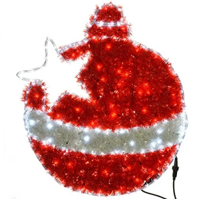 This rope light silhouette features a huge flashing bauble complete with decorative star It is inlaid with tinsel and white LED lights, the rope light around is a mixture of red and white and there's 6 m of it with 24 LED's every metre There is also a built in controller to change the speed of the flash Mains voltage plug must be mounted indoors or in a waterproof enclosure/socket Size: 74 x 82 cm (29 x 32 inches)