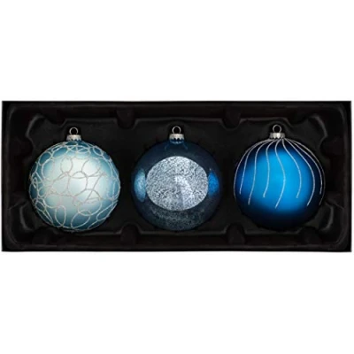 The new Antarctica bauble range is sure to make your tree stand out this year This variety pack features 3 large glass baubles that come in an tradtional shape with various designs These are Blue baubles that feature different designs 2 x Matt baubles, 1 x Shiny with Glitter Size: (H) 13 cm (D) 12 cm