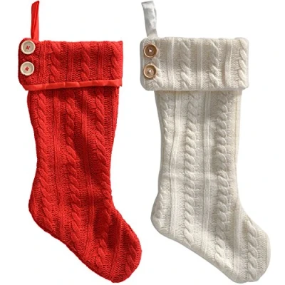 Traditional pair of knitted festive stockings Includes one red stocking and one cream stocking, each with wooden buttons Large knitted stockings ideal for multiple presents or treats Soft fabric material Size: Height 51 cm (20 inches)