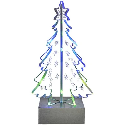 The acrylic 3D tree decoration is ideal for any side in the house or indeed a centrepiece for your festive meal Its decorated with a variety of stars and is illuminated with two colour changing LED lights It comes on a lovely silver wooden base which gives the decoration excellent stability Battery operated (requires 3 x AA batteries) Size: 15 x 15 x 21.5 cm