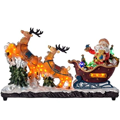 This lovely ornament features Santa in his sleigh being pulled by two reindeer The sleigh is illuminated by multi-coloured LED's whilst the reindeer look like they are really running Santa's sleigh is packed full of presents and trees and he's even carrying a little teddy BS LV transformer with 1.8 m lead wire Size: 46 cm (18 inches)