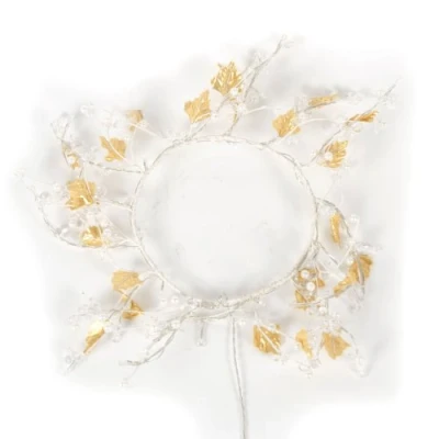 This unusual but welcome wreath is an ideal way to decorate your home during the festive period It's decorated with gold leaves and a variety of clear and frosted beads, illuminated with 45 warm white LED's Built with a robust metal frame which makes hanging quick and simple Comes with a long 5 m lead wire to the BS transformer Size: 45 cm (17 inches)