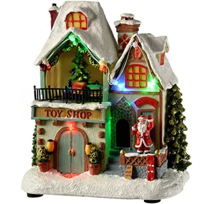 This elegant Christmas scene features a multi-coloured LED lit Christmas House with Santa outside and upstairs has a rotating Christmas tree Illuminated with seven multi-coloured LED lights An elegant decoration for any side in the house Requires 3 x AA batteries (not included) Size: Height 20 cm (8 inches)