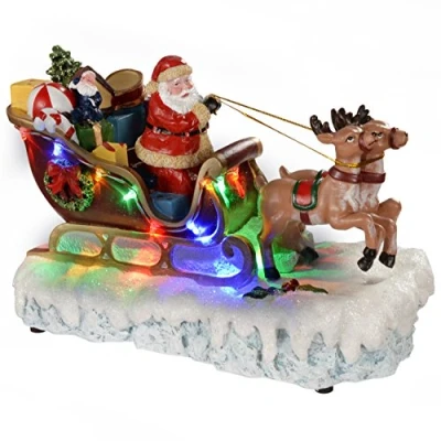 This lovely decoration features Santa in his sleigh being pulled along the snow by two animated reindeer. There's a variety of little presents in the sleigh ready for Santa to deliver plus the reindeer move up and down. It's also illuminated by multi colour leds that make this a really eye-catching decoration. Requires 3 x AA Batteries (Not Supplied) Size: 26.5 x 13 x 7.5cm (10.4 x 5.1 x 3 inches)