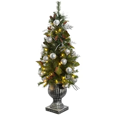 This elegant potted tree stands at 4 feet and comes pre-lit with 50 warm white LED lights Features 140 PVC tips and decorated with silver baubles and pine cones BS low voltage transformer with 5 m lead wire included Can be used indoors or outdoors provided the BS transformer is mounted inside or in a weatherproof socket Size: Height 4 feet (1.2 m), tree bottom diameter 50 cm (20 inches) This elegant potted tree stands at 4 feet and comes pre-lit with 50 warm white LEDs The tree is made with 140 tips for an authentic look and the decorative pot finishes the look good BS low voltage transformer included Can be used indoors or outdoors provided the BS Transformer is mounted inside or in a weatherproof socket Size: Height 4 feet (1.2 m), tree bottom diameter 20 inch