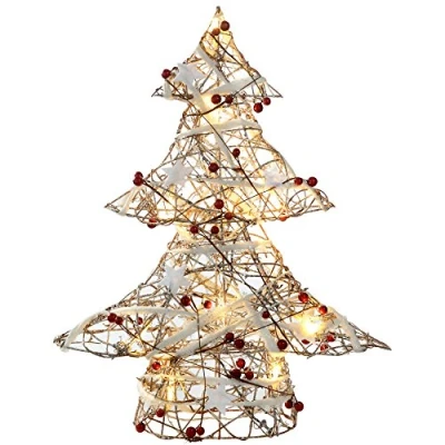 AmazonElegant rattan Christmas tree, decorated with snow, stars and red berries Pre-lit Christmas decoration illuminated with 10 warm white LED lights Indoor item only, battery operated with 50 cm lead wire Requires 2 x AA battery (battery not included) Size: Height 48 cm