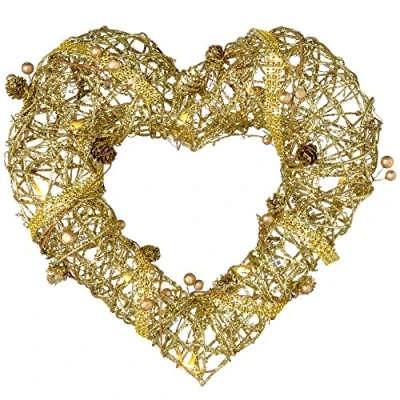 WeRChristmas Pre Lit Rattan Warm White LED Heart Wreath with Beads and Pinecones, 33 cm Gold