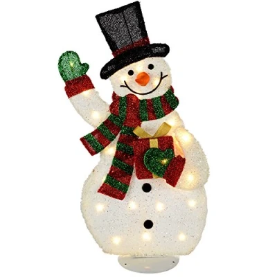 This elegant decoration features a festive snowman carrying a present and wearing a lovely hat and scarf It's been illuminated by 20 warm white LED's to provide a gentle glow The frame has been covered with fabric and a dusting of shimmering glitter for a glow when illuminated Requires 3 x AA batteries (not supplied) Size: 82 x 40 x 20 cm The silhouette style decoration features a waving snowman complete with hat, scarf and gloves It's been illuminated by 20 warm white leds too The frame has been covered with fabric which emits a beautiful glow when illuminated Requires 3 x AA batteries (not supplied) Size: 40 x 20 x 82 cm; (15.7 x 7.9 x 32.3 inches)