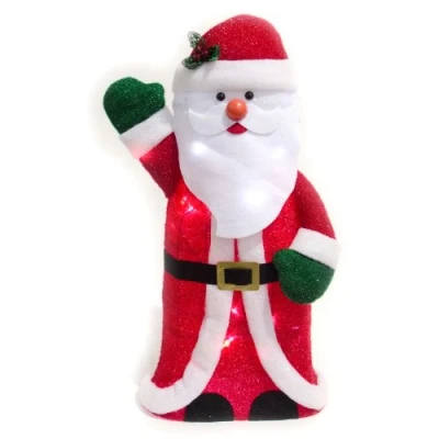 This Santa figure is made from a robust metal frame with a tinsel and glitter covering which has a lovely sheen He's illuminated with 30 white LED lights He's dressed in his traditional red and white and has green gloves and a black belt with a buckle Requires 3 x AA batteries (not included) Size: 80 cm (31 inches)