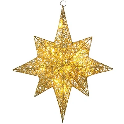 Elegant gold string Christmas star with hanging hoop for easy set up Pre-lit Christmas decoration illuminated with 10 warm white LED lights Indoor use only, battery operated with 50 cm lead wire Requires 2 x AA battery (battery not included) Size: Height 48 cm