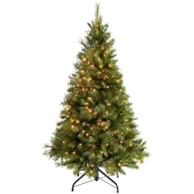 WeRChristmas 7 ft Victorian pine tree is made with a hinged construction and 1577 PVC Tips for a full bushy effect The lights have a variety of functions including flash, twinkle, chasing, fade, static or on/off It's illuminated too with 500 warm white LED's and looks striking when plugged in Comes complete with foldable metal stand and UK low voltage transformer Size: Height 7 ft (2.1 m), tree base diameter 54 inch (13.8 m)