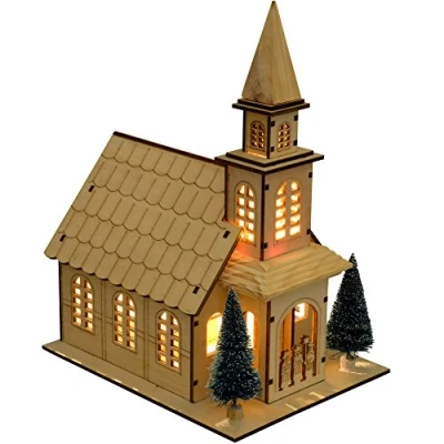 8 inch wooden church with three warm white LED Lights This lovely wooden church is an ideal decoration for mantelpieces or window Ledges Its illuminated with three warm white LEDs that shine elegantly through the windows and the spire Outside the door are three carol singers and two lovely green trees to either side Requires 3 x AA batteries (not supplied)