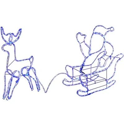 This elegant rope light silhouette features one reindeer with Santa on his sleigh Blue LED rope light design on a robust metal frame for easy setup An ideal way to decorate the outside of your house at Christmas and makes for a wonderful welcome for your guests 1.5 m lead wire, plug must be mounted indoors or in a waterproof socket Size: 180 x 28 x 64 cm