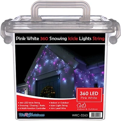 These pink and white chasing LED icicle lights are an ideal way to produce fantastic lighting effect around the home There's 360 on this set in the arrangement of 3/7/4/6 lights per string which is then repeated until the end of the chain It comes complete with eight setting controller to adjust the lighting effects too and the strings are spaced 15 cm apart There's an extra long 10 m lead wire too from the transformer and the controller is situated 2 m away from the transformer Light chain length 8.8 m - overall length includes lead wire 18.8 m - cable colour - white