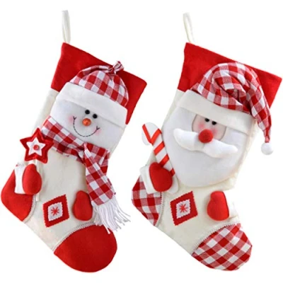Features a snowman and Santa with a red and white festive pattern 3D snowman and Santa head with White and red Tartan hat and scarf Large felt stocking ideal for multiple presents or treats Soft fabric material Height: 48 cm/ 19 inches each Width: 30 cm/ 11.5 inches each