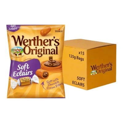 RICH CARAMEL & CHOCOLATE FILLING IN EVERY BITE: Werther's Original soft chocolate eclairs combine creamy filling with indulgent caramel and chocolate—bringing irresistible sweetness to your day INDIVIDUALLY WRAPPED FOR EASY SHARING: Each sweet is wrapped for freshness and convenience, making it perfect for gifting, office bowls, or festive gatherings—so everyone gets a comforting treat GLUTEN-FREE & VEGETARIAN FRIENDLY: Enjoy worry-free indulgence with chocolate eclairs that suit a variety of dietary needs—ideal for inclusive snacking and thoughtful celebrations CONVENIENT PACK FOR ON-THE-GO SNACKING: With 125 g of soft chocolate eclairs in each pack, you’ll always have a delicious snack ready—whether you're relaxing, working, or travelling A CLASSIC TREAT FOR ANY OCCASION: From winter evenings to holiday parties, Werther's Original brings warmth and nostalgia—because some sweets never go out of style