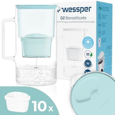 The innovative water carafe - made of resistant to high temperature fluctuations borosilicate glass protects the drink from impurities thanks to the low solubility and does not change the taste 3 in 1 water filter glass jug - multifunctional jug for use as: 1) water filter jug, 2) stylish glass carafe for dinner, 3) glass jug of water for tea, cool drinks (even hot) or cooking Easy to use – the filter jugs for drinking water can be easily filled by turning the lid with your finger. The filter water jug is dishwasher safe. All parts come into contact with water are BPA free Design - The simple and great design of the water filter jug is an eye-catcher on the kitchen and living room table. Stylish and eco-friendly alternative to water bottles Features - The water jug with filter reduces: chlorine, microparticles and taste-impairing substances in tap water - preserves valuable minerals thanks to activated carbon from coconut shells, compatible with Brita Maxtra filter cartridges and many more, Weight: 5.1588169308 pounds, Manufacturer: Wessper