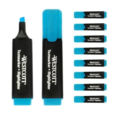 Highlighters in a value pack - 10 pack of bright blue Westcott highlighters for the office, university or school. Precise highlighting of text passages - The cut wedge tip enables clean marking with a line width of 2-5 mm. The high-quality premium ink from Germany absorbs extremely quickly and is ideal for marking text on different types of paper without smudging. Anti-drying technology - The German ink technology with cap-off function ensures that the pens can be stored open for up to 2 hours without drying out. Quality since 1872 - The Westcott brand has stood for household and office products with an unmistakable design and unrivalled value for money for 140 years.