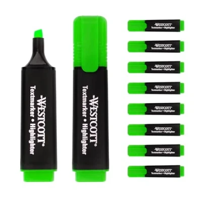 Highlighters in a value pack - 10 pack of bright green Westcott highlighters for the office, university or school. Precise highlighting of text passages - The cut wedge tip enables clean marking with a line width of 2-5 mm. The high-quality premium ink from Germany absorbs extremely quickly and is ideal for marking text on different types of paper without smudging. Anti-drying technology - The German ink technology with cap-off function ensures that the pens can be stored open for up to 2 hours without drying out. Quality since 1872 - The Westcott brand has stood for household and office products with an unmistakable design and unrivalled value for money for 140 years.