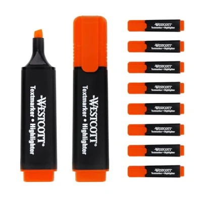 Highlighters in a value pack - 10 pack of bright orange Westcott highlighters for the office, university or school. Precise highlighting of text passages - The cut wedge tip enables clean marking with a line width of 2-5 mm. The high-quality premium ink from Germany absorbs extremely quickly and is ideal for marking text on different types of paper without smudging. Anti-drying technology - The German ink technology with cap-off function ensures that the pens can be stored open for up to 2 hours without drying out. Quality since 1872 - The Westcott brand has stood for household and office products with an unmistakable design and unrivalled value for money for 140 years.