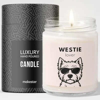 Westie Gifts Luxury Soy Wax Candle Vanilla, Jasmine, Sugared Almond Dogs in Shades Makester