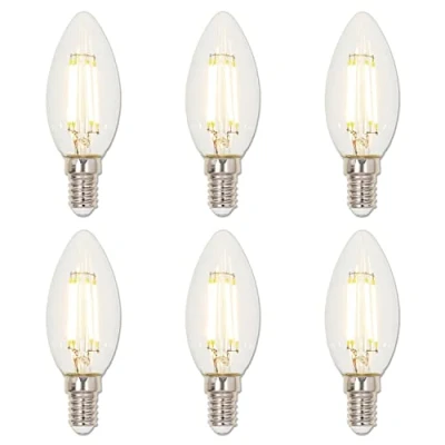 6-pack C35 decorative filament LED bulbs provide the look and feel of incandescent light bulbs, ideal for chandeliers and sconces Energy-efficient LED replaces incandescent 40-watt light bulbs and uses only 4,2 watts of energy, conserving up to 90% Brightness of 470 lumens, and warm white light appearance (2700K) Dimmable, E14 base, clear finish, damp rated, approved for use in enclosed fixtures LEDs turn on instantly to full brightness and last 15,000 average rated hours, years longer than conventional light bulbs
