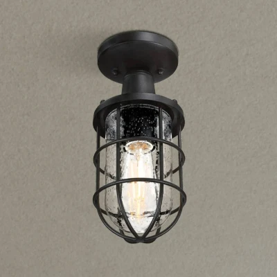 Cage-shaped Crestview outdoor ceiling light made of steel and hand-blown antique glass The robust housing of the Crestview outdoor ceiling light is made of steel with a textured black surface and is shaped like a cage. Inside is a lampshade made of glass with fine air inclusions. The antique glass creates a slightly diffused light and is also very attractive to look at up close when this ceiling light is not switched on. Crestview is very suitable for outdoor use, for example above the entrance, as well as in the basement, as it is protected against splashing water (IP44). Filament bulbs, for example, can be used to full effect in its blown glass lampshade and tinted bulbs can be used to create a particularly pleasant atmosphere.