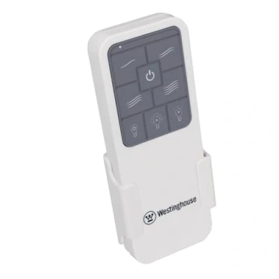General description Compatible with all Westinghouse ceiling fans featuring an AC motor, this remote control allows for convenient operation of your ceiling fan and light settings. Technical specifications Colour: White Fan control: 4 speeds / on / off Light control: on / off / dimmer Frequency range: 433.9 MHz Batteries: 2 x AAA (not included) Compatibility and accessories Suitable for all Westinghouse ceiling fans with AC motor (except hugger-mount style fans) Remote kit includes: handheld transmitter, receiver unit, wall bracket for transmitter storage Usage The remote control features illuminated buttons, making it easy to see and operate in dark spaces.